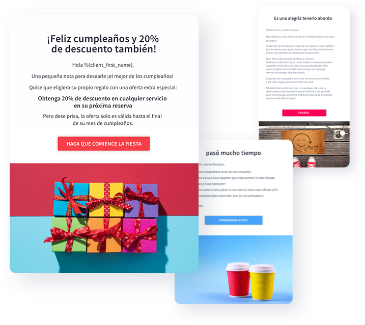 La función le brinda acceso a 3 campañas desarrolladas por nuestro equipo de marketing para atraer y retener a sus clientes: un correo electrónico de “bienvenida” para los nuevos clientes, un correo electrónico de feliz cumpleaños y un correo electrónico para los clientes inactivos. ¡Concilia la eficacia y la seducción!