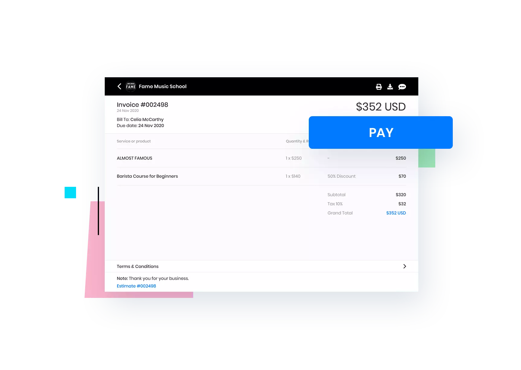 Reduzca las fricciones al ofrecer opciones de pago fáciles y flexibles. Acepte pagos en línea o desde el móvil las 24/7 al agregar un sencillo botón a sus facturas y envíe la factura por SMS a su cliente.