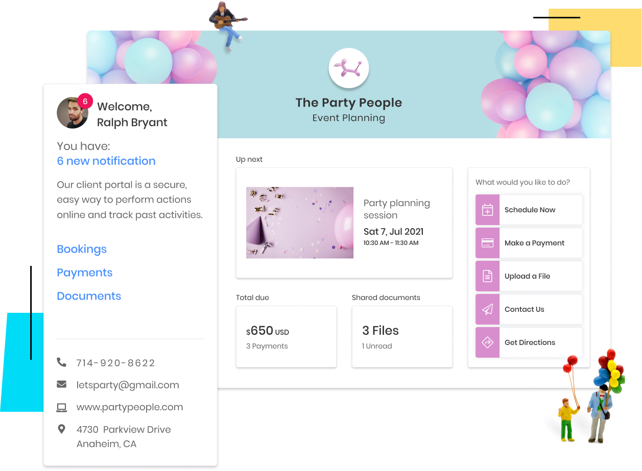 Invite your clients to book their next appointment, pay, share a document, or get in touch anytime and anywhere.