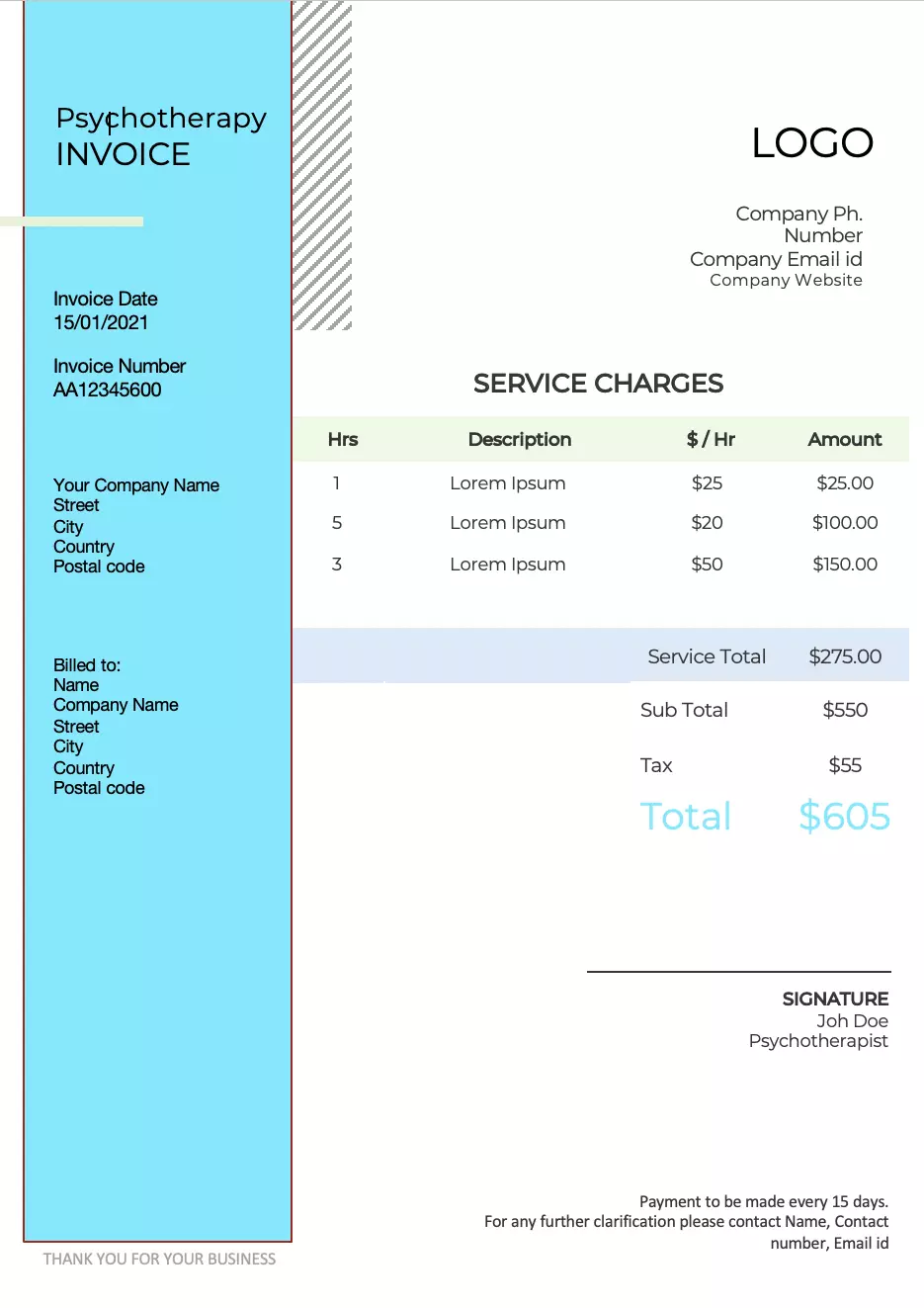 Finding an invoice that’s just right is crucial when you’re offering longer-term treatment. Our psychotherapy invoice template offers space for your credentials and diagnostic numbers, as well as a space for session fees that you can tailor to fit your specialized area of practice.